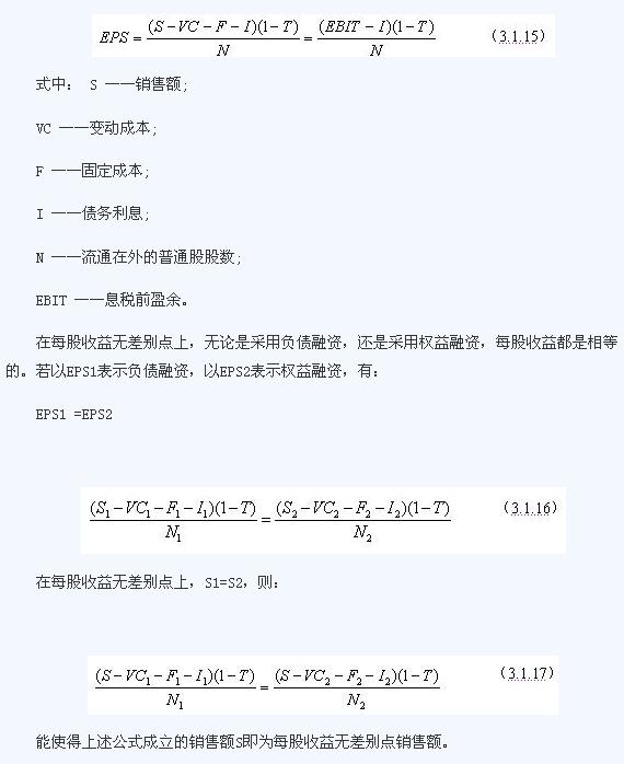 每股收益分析是利用每股收益的無差別點進(jìn)行的。所謂每股收益的無差別點,是指每股收益不受融資方式影響的銷售水平。根據(jù)每股收益無差別點,可以分析判斷不同銷售水平下適用的資本結(jié)構(gòu)。每股收益EPS的計算式如下: