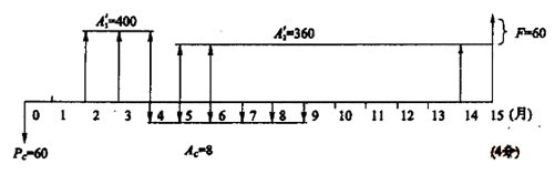 P V=400(P/A,1%,3)(P/F,1%,1)+360(P/A,1%,11)(P/F,1%,4)+60(P/F,1%,15)-60-8(P/A,1%,6)(P/F,1%,3) (1分)