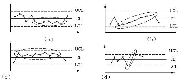 (2)分析控制圖。當(dāng)控制圖中的點(diǎn)子滿足以下兩個(gè)條件時(shí):一是點(diǎn)子沒有跳出控制界限;二是點(diǎn)子隨機(jī)排列且沒有缺陷,即可認(rèn)為生產(chǎn)過程基本上處于控制狀態(tài),即生產(chǎn)正常。否則,就認(rèn)為生產(chǎn)過程發(fā)生了異常變化。這里所說的點(diǎn)子在控制界限內(nèi)排列有缺陷,包括以下幾種情況: