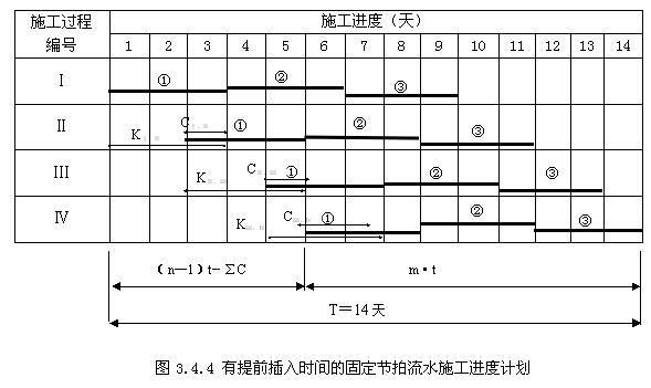 2)有提前插入時(shí)間的固定節(jié)拍流水施工。所謂提前插入時(shí)間,是指相鄰兩個(gè)專業(yè)工作隊(duì)在同一施工段上共同作業(yè)的時(shí)間。在工作面允許和資源有保證的前提下,專業(yè)工作隊(duì)提前插入施工,可以縮短流水施工工期。對于有提前插入時(shí)間(