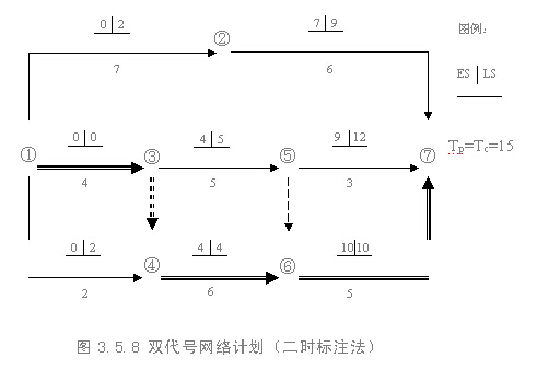 在上述計算過程中,是將每項工作的六個時間參數(shù)均標(biāo)注在圖中,故稱為六時標(biāo)注法,某工程雙代號網(wǎng)絡(luò)計劃如圖3.5.7所示。為使網(wǎng)絡(luò)計劃的圖面更加簡潔,在雙代號網(wǎng)絡(luò)計劃中,除各項工作的持續(xù)時間以外,通常只需標(biāo)注兩個最基本的時間參數(shù)――各項工作的最早開始時間和最遲開始時間即可,而工作的其它四個時間參數(shù)(最早完成時間、最遲完成時間、總時差和自由時差)均可根據(jù)工作的最早開始時間、最遲開始時間及持續(xù)時間導(dǎo)出。這種方法稱為二時標(biāo)注法,如圖3.5.8所示。