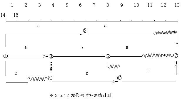 圖3.5.7所示的雙代號網(wǎng)絡(luò)計劃對應(yīng)的時標(biāo)網(wǎng)絡(luò)計劃如圖3.5.12所示。