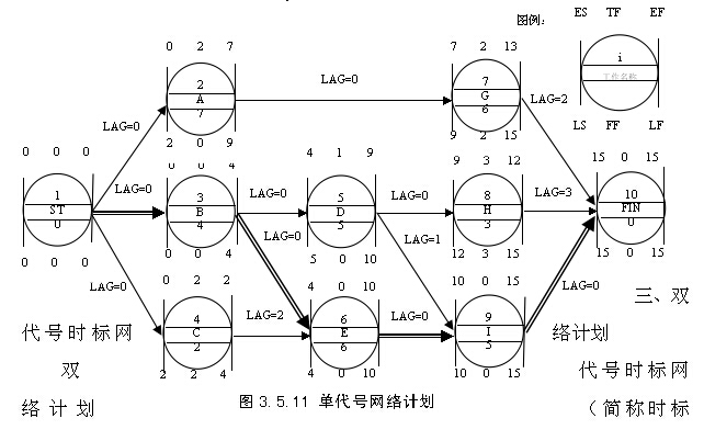 (1)最早開始時間和最早完成時間。工作的最早開始時間是指在其所有緊前工作全部完成后,本工作有可能開始的最早時刻。工作的最早完成時間是指在其所有緊前工作全部完成后,本工作有可能完成的最早時刻。工作的最早完成時間等于本工作的最早開始時間與其持續(xù)時間之和。
