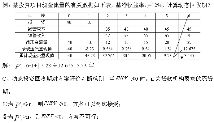 3)動(dòng)態(tài)投資回收期:在考慮了時(shí)間價(jià)值的情況下,以項(xiàng)目每年的凈收益回收全部投資所需的時(shí)間。