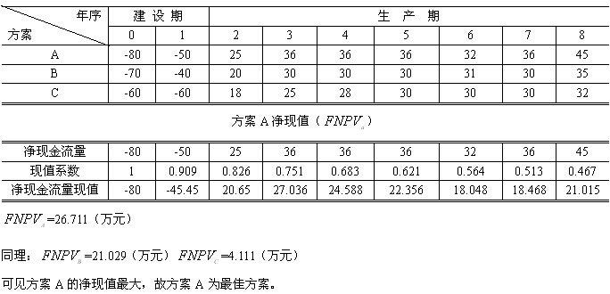 例:現(xiàn)有A、B、C三個(gè)互斥方案,其壽命期均為8年,各方案的凈現(xiàn)金流量見(jiàn)下表,已知=10%,試用凈現(xiàn)值法選擇最佳方案。