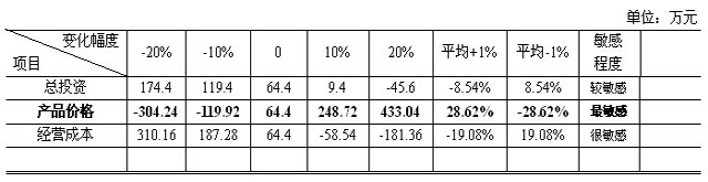敏感性因素確定:項(xiàng)目總投資、產(chǎn)品價(jià)格、經(jīng)營成本的所有因素中,任何一個(gè)因素的變化都會(huì)導(dǎo)致凈現(xiàn)值發(fā)生變化,所以應(yīng)對這些因素進(jìn)行敏感性分析。