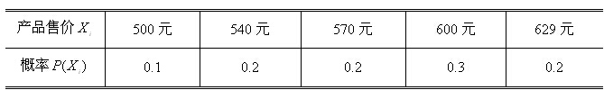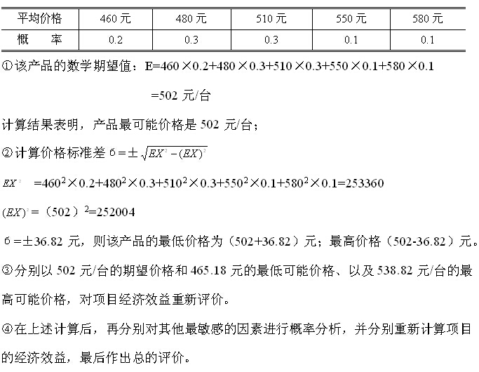 在項目原經(jīng)濟效益測算中,該產(chǎn)品的加權(quán)平均價格為500元/臺,現(xiàn)經(jīng)老師預(yù)測,該產(chǎn)品的平均價格及概率分布見下表,試對該產(chǎn)品作出概率分析,并重新計算項目的經(jīng)濟效益。