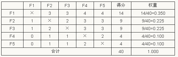 根據(jù)題給條件對這五個指標(biāo)進(jìn)行重要性排序?yàn)椋篎1>F2=F3>F4=F5,再利用0-4法計(jì)算各項(xiàng)功能指標(biāo)的權(quán)重,計(jì)算結(jié)果見表2-12。
