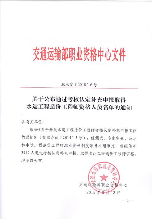 水運工程造價工程師資格人員名單的通知