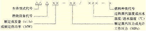 每臺鍋爐都用一個規(guī)定型號來表示,我國工業(yè)鍋爐產(chǎn)品型號由三部分組成,各部分之間用短橫線相連。