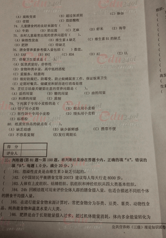 2012年11月公共營養(yǎng)師三級(jí)理論知識(shí)考試真題