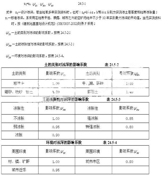 式中 hmax—基礎(chǔ)底面下允許殘留凍土層的最大厚度,按表24.5-5查取。當(dāng)凍深范圍內(nèi)地基由不同凍脹性土層組成時(shí),基礎(chǔ)最小埋深可按下層土確定,但不宜淺于下層土的頂面。當(dāng)有充分依據(jù)時(shí),基底下允許殘留凍土層厚度也可根據(jù)當(dāng)?shù)亟?jīng)驗(yàn)確定。