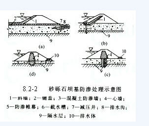 當(dāng)?shù)[石透水層不厚時(shí),可挖出梯形槽回填黏土成為截水槽。當(dāng)透水層較厚時(shí),可用板樁、連續(xù)的混凝土排樁和混凝土防滲墻等垂直防滲措施截?cái)嗤杆畬?,如圖8.2-2(b)所示。對(duì)于防滲要求較高的砂礫壩基,可用相互搭接的大直徑鉆孔樁穿過透水層,形成一道連續(xù)橫向防滲墻。