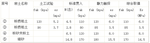 根據(jù)土工實(shí)驗成果、標(biāo)準(zhǔn)貫入試驗強(qiáng)度指標(biāo)(理論公式法)以及靜力觸探等方法,分別進(jìn)行各層土承載力特征值和壓縮模量的計算。根據(jù)計算結(jié)果綜合分析,確定各層土承載力特征值的綜合取值。結(jié)合區(qū)域經(jīng)驗,綜合確定各土層的壓縮模量標(biāo)準(zhǔn)值的建議值。見表6。