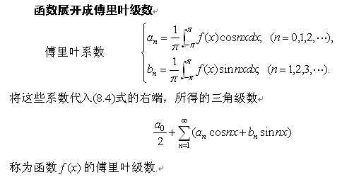 狄利克雷收斂定理告訴我們:只要函數(shù) 在區(qū)間 上至多只有有限個的第一類間斷點,并且不作無限次振動,則函數(shù) 的傅里葉級數(shù)在函數(shù)的連續(xù)點處收斂于到該點的函數(shù)值,在函數(shù)的間斷點處收斂于該點處的函數(shù)的左極限與右極限的算術(shù)平均值. 由此可見,函數(shù)展開成傅里葉級數(shù)的條件要比函數(shù)展開成冪級數(shù)的條件低得多.
