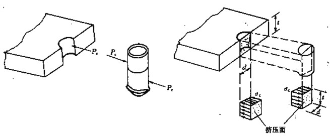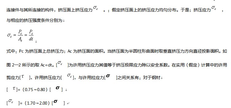 在承載的同時,連接件與其所連接的構(gòu)件在相互直接接觸面上發(fā)生擠壓,因而產(chǎn)生的應(yīng)力稱為擠壓應(yīng)力。當(dāng)擠壓應(yīng)力過大時,將導(dǎo)致兩者接觸面的局部區(qū)域產(chǎn)生顯著塑性變形,因而影響它們的正常配合工作,連接松動。為此必須考慮它們的擠壓強度問題。如圖2―2所示的鉚釘連接中的鉚釘與鋼板間的擠壓。