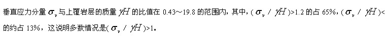 巖體天然應(yīng)力的垂直分量,一般認(rèn)為等于該點(diǎn)的上覆巖層的質(zhì)量 。但從國(guó)內(nèi)實(shí)測(cè)資料(工程巖體分級(jí)標(biāo)準(zhǔn)(GB50216―94)條文說明)看,