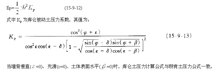 庫(kù)侖被動(dòng)土壓力計(jì)算公式的推導(dǎo)與庫(kù)侖主動(dòng)土壓力的方法相似,計(jì)算公式如下: