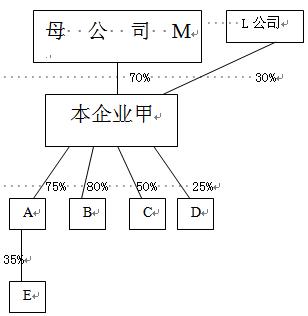 【補(bǔ)充例】假設(shè)本企業(yè)為甲公司,其投資與被投資情況(如下圖):甲企業(yè)的母公司為M公司,所占股權(quán)比例為70%,另一投資者L公司所占股權(quán)比例為30%;甲企業(yè)直接投資A、B、C、D四家公司,股權(quán)比例分別為75%、80%、50%、25%;A公司投資E公司,所占股權(quán)比例為35%。