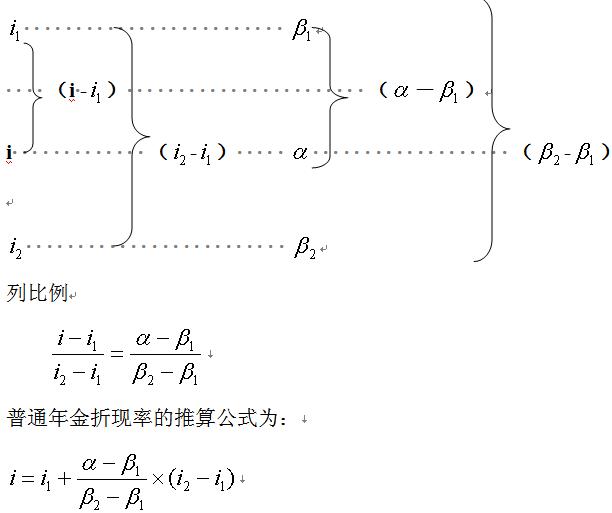 若所求的折現(xiàn)率為i,對(duì)應(yīng)的年金現(xiàn)值系數(shù)為α;i1、i2分別為與i相鄰的兩個(gè)折現(xiàn)率,且i1