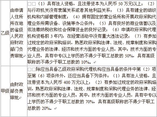(1)甲級政府采購代理機構資格由財政部負責審批。