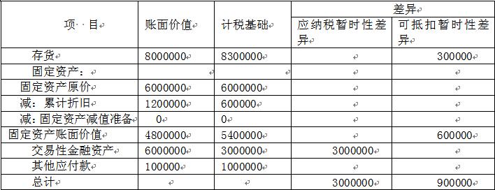 (3)期末持有的交易性金融資產(chǎn)成本為300萬(wàn)元,公允價(jià)值為600萬(wàn)元。稅法規(guī)定,資產(chǎn)在持有期間公允價(jià)值的變動(dòng)不計(jì)入應(yīng)納稅所得額(應(yīng)納稅暫時(shí)性)。