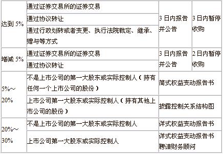1、通過證券交易所的證券交易(通過協(xié)議轉(zhuǎn)讓或通過行政劃轉(zhuǎn)或者變更、執(zhí)行法院裁定、繼承、贈與等)方式,投資者及其一致行動人擁有權(quán)益的股份達到一個上市公司已發(fā)行股份的5%時,應(yīng)當(dāng)在該事實發(fā)生之日起3日內(nèi)編制權(quán)益變動報告書,向中國證監(jiān)會、證券交易所提交書面報告,抄報該上市公司所在地的中國證監(jiān)會派出機構(gòu)(以下簡稱派出機構(gòu)),通知該上市公司,并予公告;在上述期限內(nèi),不得再行買賣該上市公司的股票。