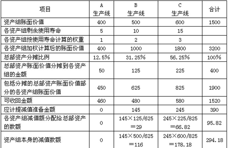 分析:進行資產(chǎn)減值測試,首先要將總部資產(chǎn)采用合理的方法分配至各資產(chǎn)組,然后比較各資產(chǎn)組的可收回金額與賬面價值,最后將各資產(chǎn)組的資產(chǎn)減值額在總部資產(chǎn)和各資產(chǎn)組之間分配。