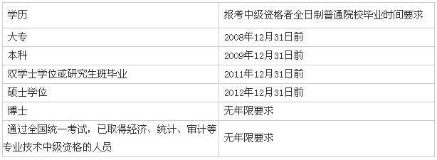答:下列不同學(xué)歷水平的考生,今年報(bào)考中級資格考試最晚取得會(huì)計(jì)從業(yè)資格證書時(shí)間。只有在下表所列時(shí)間前且符合相關(guān)條件的考生,方可報(bào)名參加2013年會(huì)計(jì)專業(yè)技術(shù)中級資格考試: