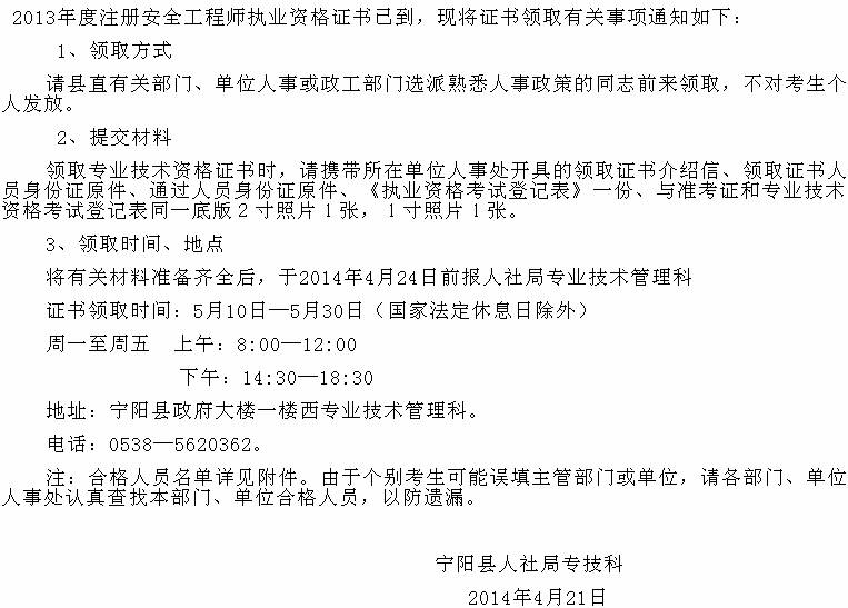 寧陽(yáng)2013年安全工程師考試合格證書領(lǐng)取通知