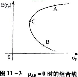 圖11-3中,C點(diǎn)為最小方差組合。結(jié)合線上介于A與B之間的點(diǎn)代表的組合由同時(shí)買入證券A和B構(gòu)成,越靠近A,買入A越多,買入B越少。而A點(diǎn)東北部曲線上的點(diǎn)代表的組合由賣空B,買入A形成,越向東北部移動(dòng),組合中賣空B越多;反之,B的東南部曲線上的點(diǎn)代表的組合由賣空A、買入B形成,越向東南部曲線上的點(diǎn)代表的組合由賣空A、買入B形成,越向東南部移動(dòng),組合中賣空A越多。