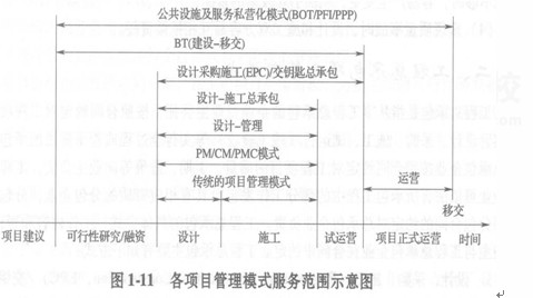 根據(jù)工程項(xiàng)目的合同關(guān)系與組織管理關(guān)系的不同,考慮工程項(xiàng)目融資、設(shè)計(jì)、采購、施工、運(yùn)營的一體化程度,工程項(xiàng)目的管理模式的服務(wù)范圍如圖1―11所示。