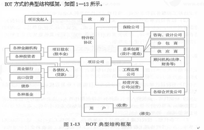 BOT有時(shí)也稱為“特許經(jīng)營權(quán)”(Concession)方式,它是指某一財(cái)團(tuán)或若干投資人作為項(xiàng)目的發(fā)起人,從一個(gè)國家的中央或地方政府獲得某項(xiàng)基礎(chǔ)設(shè)施的特許建造經(jīng)營權(quán),