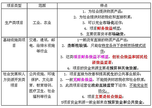 國(guó)際上項(xiàng)目的分類(lèi)主要以項(xiàng)目的產(chǎn)出物性質(zhì)、服務(wù)對(duì)象、效益特點(diǎn)、對(duì)社會(huì)的貢獻(xiàn)、資金來(lái)源等方面,將項(xiàng)目分為三大類(lèi):生產(chǎn)類(lèi)項(xiàng)目;基礎(chǔ)設(shè)施類(lèi)項(xiàng)目;社會(huì)發(fā)展和人力資源開(kāi)發(fā)類(lèi)項(xiàng)目。具體分類(lèi)如表1-1所示。