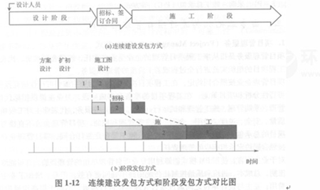 由業(yè)主委托的CM方式項目負(fù)責(zé)人(ConstructionManager,以下簡稱CM經(jīng)理)與設(shè)計單位、咨詢工程師組成一個聯(lián)合小組,共同負(fù)責(zé)組織和管理工程的規(guī)劃、設(shè)計和施工。在項目的總體規(guī)劃、布局和設(shè)計時,要考慮到控制項目的總投資,在主體設(shè)計方案確定后,完成一部分工程的設(shè)計,即對這一部分工程進(jìn)行招標(biāo),發(fā)包給一家承包商施工,由業(yè)主直接與承包商簽訂施工承包合同。傳統(tǒng)的連續(xù)建設(shè)模式的招標(biāo)發(fā)包方式與階段發(fā)包方式的比較如圖1―12所示。