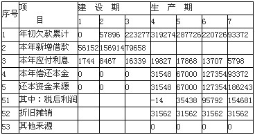 償還本金的資金來源包括可用于還款的稅后利潤、折舊攤銷及其他項目中,第7年初欠款累計為93372,但第7年可用于還款的資金來源達(dá)到186243,因此借款償還期為:6+93772/186243=6.5(年)