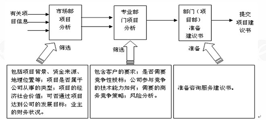 這個過程是為了避免投標的盲目性,減少執(zhí)行項目的風險;同時通過項目選擇性,體現(xiàn)和貫徹公司的經(jīng)營戰(zhàn)略。項目的分析和篩選過程一般要經(jīng)過三個步驟: