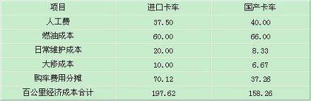 綜合以上各項(xiàng),進(jìn)口卡車與國(guó)產(chǎn)卡車百公里經(jīng)濟(jì)成本比較見下表。