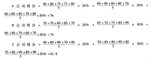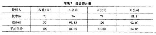(2)商務(wù)標(biāo)評審:A、B、C三家咨詢公司的投標(biāo)報價中,B公司最低,計為100分;A公司商務(wù)標(biāo)按“反比例遞減法”得分:(115/120)×100=95.83;C公司商務(wù)標(biāo)按“反比例遞減法”得分:(115/125)×100=92.00。