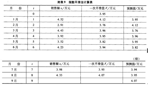 按照指數(shù)平滑法計算公式F1=0.3xt+0.4Ft-1計算可得指數(shù)平滑法計算表見附表9。