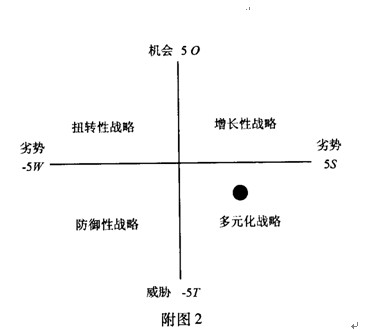 然后畫出SWOT分析圖,如附圖2所示,再根據(jù)評價得分標(biāo)注公司所處的象限如下: