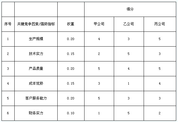 甲公司目前主營產(chǎn)品為A,甲公司同兩個主要競爭對手乙公司和丙公司的競爭態(tài)勢矩陣見表1。表1競爭態(tài)勢矩陣