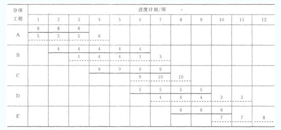 某工程計劃進(jìn)度與實際進(jìn)度見表4。表中粗實線表示計劃進(jìn)度(進(jìn)度線上方的數(shù)據(jù)為每周計劃投資),粗虛線表示實際進(jìn)度(進(jìn)度線上方的數(shù)據(jù)為每周實際投資),假定各分項工程每周計劃進(jìn)度與實際進(jìn)度均為勻速進(jìn)度,而且各分項工程實際完成總工程量與計劃完成總工程量相等。