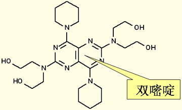 結(jié)構(gòu)特點(diǎn):分子結(jié)構(gòu)有一定對(duì)稱性。以嘧啶并嘧啶為母體,在嘧啶環(huán)2位連有二羥乙氨基,在4位連有1-哌啶基。